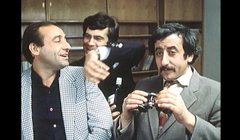 Тримата мераклии си остават така, както са били, на прозореца с биноклите ...