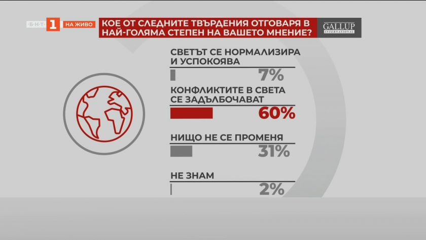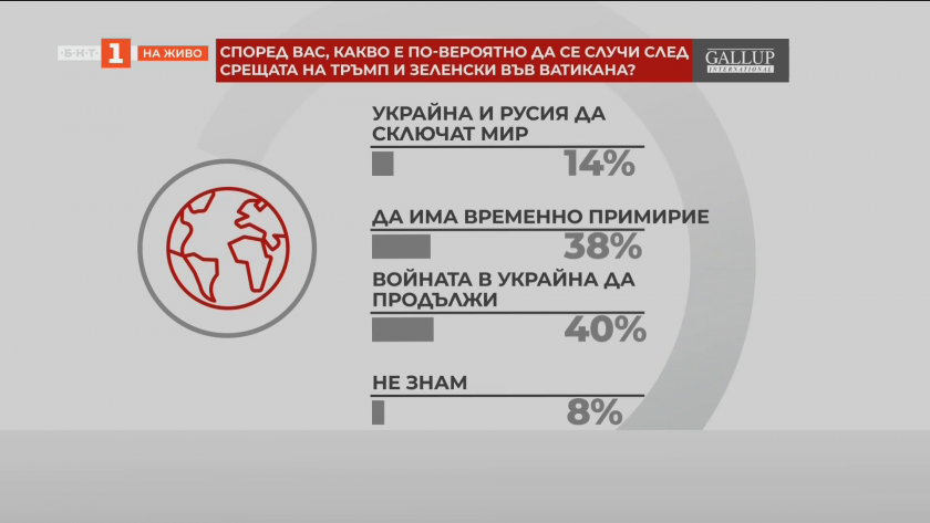Нормализира ли се светът или конфликтите в него се задълбочават? Дали след срещата на Тръмп - Зеленски във Ватикана, Украйна и Русия ще сключат мир или напротив? Кои държави ще понесат най-големи загуби от търговските войни? Как отговарят хората на тези въпроси ще разберем от социологията на „Галъп“ за предаването.