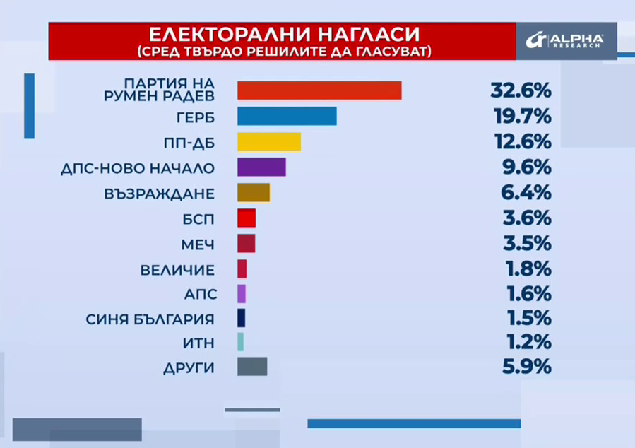 Социологът от "Алфа Рисърч" Боряна Димитрова заяви в "Още от деня", че ако изборите бяха днес, политическата карта на парламента би изглеждала така: една доста голяма политическа сила, която до момента не е била представяна в българския парламент - "Прогресивна България" на Румен Радев събира около 1/3 от депутатите биха били в парламентарна зала. Следващата политическа сила е ГЕРБ. Тя запазва настоящия профил на депутатите. Запазва твърдото си електорално тяло, но без потенциал за разрастване. ПП-ДБ - трети, ДПС на Делян Пеевски - четвърти. Последната партия, която към този момент прескача 4-процентовата бариера, е "Възраждане".