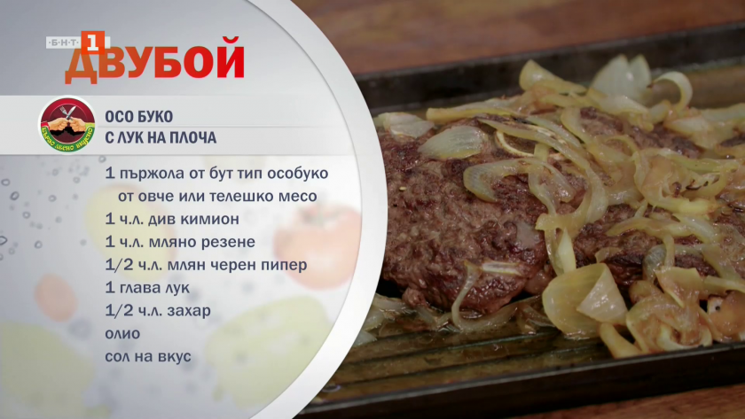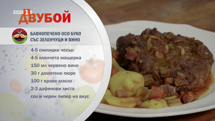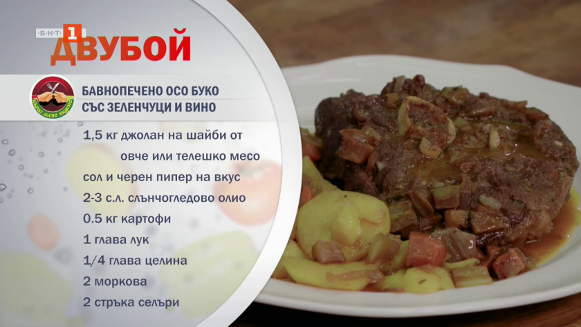 Бавнопечено осо буко със зеленчуци и вино и осо буко с лук на плоча
