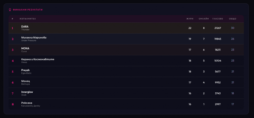 БНТ заявява, че циркулиращи в социалните мрежи таблици и скрийншоти от платформата за гласуване категорично не отговарят на истината и си запазва правото да защити репутацията си и доверието в националната селекция чрез предвидените в закона механизми.