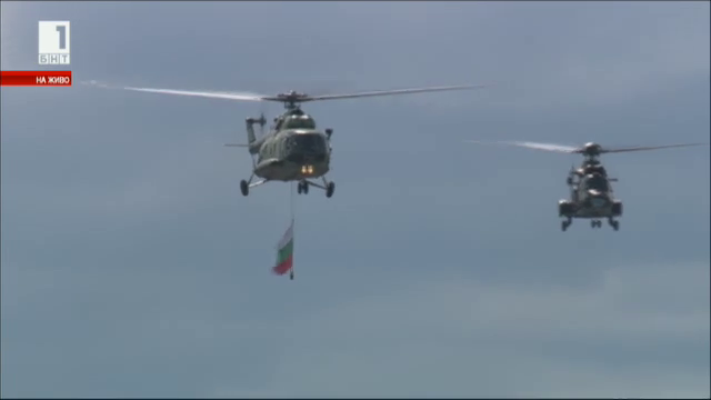 The parade was opened by a Mi-17 helicopter, which flew over Knyaz Alexander I Square, carrying the national flag and escorted by two Cougar helicopters.