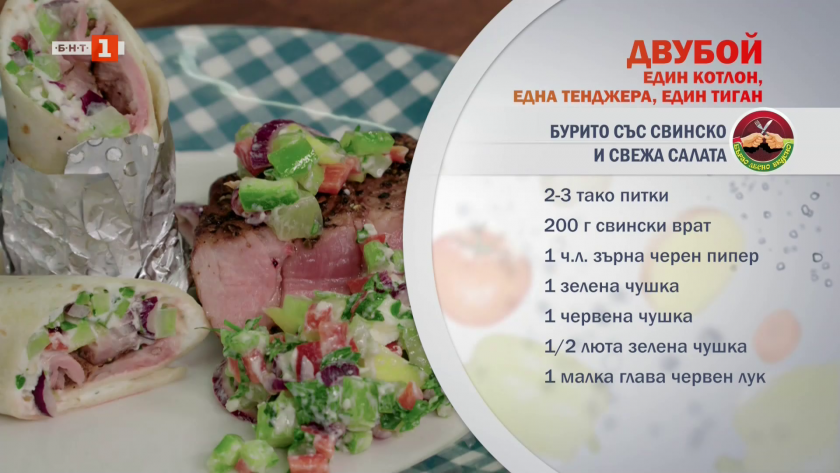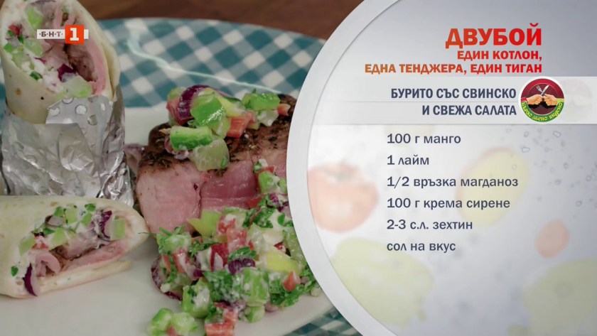 Бурито със свинско и свежа салата и топла разядка с люти чушки