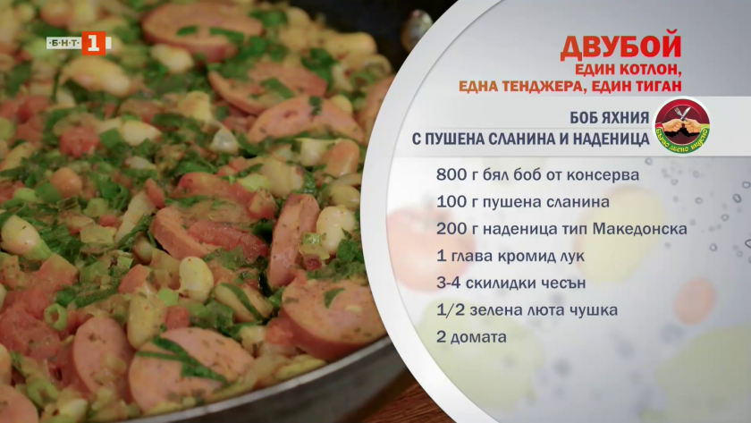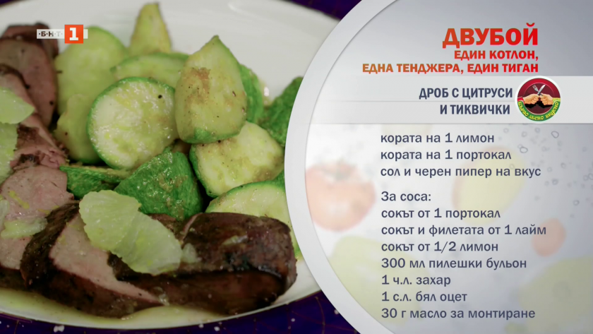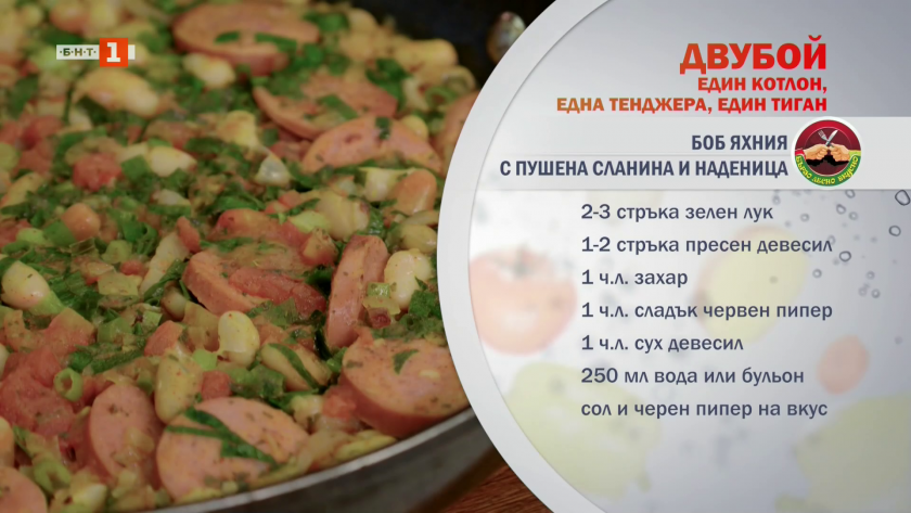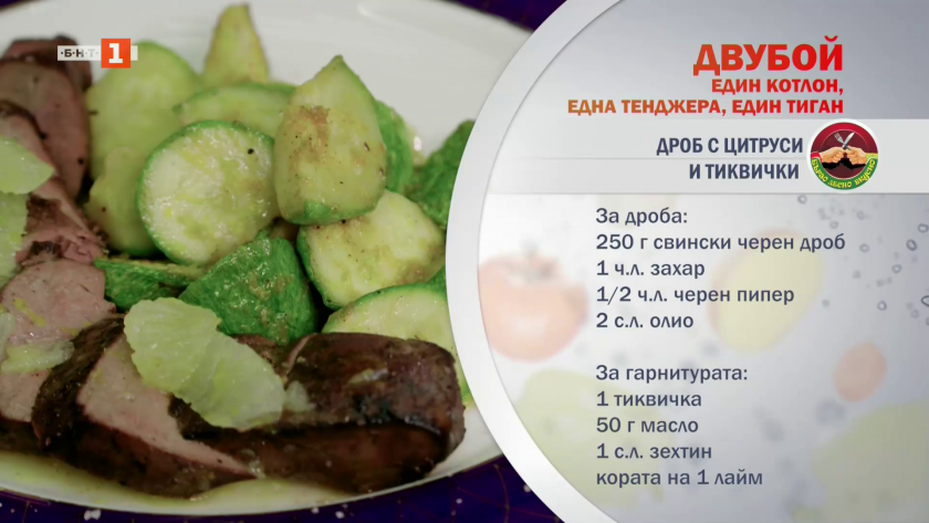 Черен дроб с тиквички и цитруси и боб яхния с пушена наденица и сланина