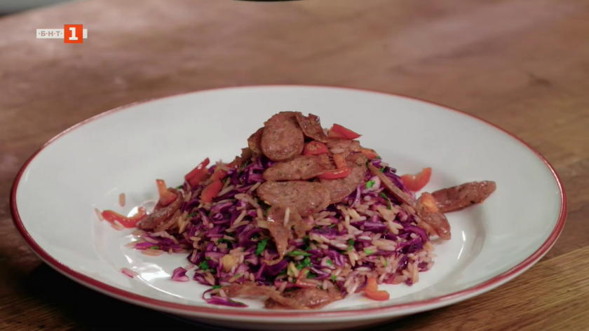 Салата от червено зеле с ориз и суджук
