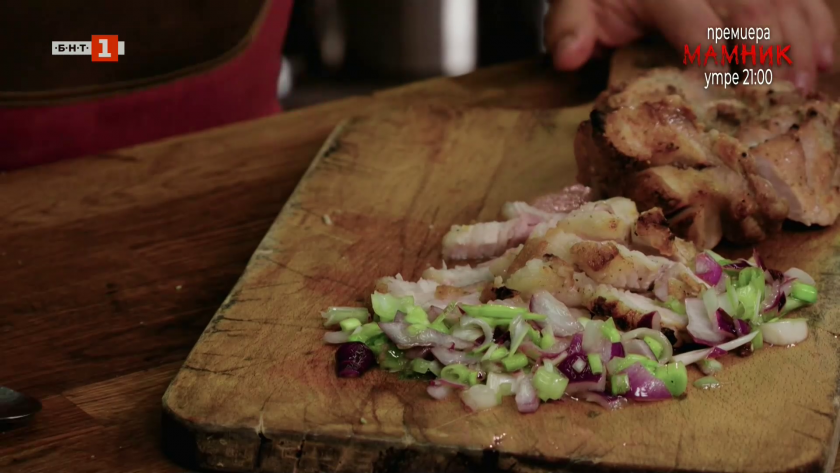 Пълнени пържоли с бекон и гризини с бекон, карамелизиран лук и сирена