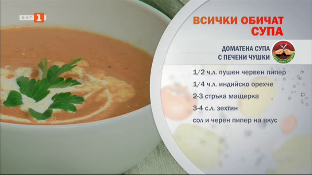 Доматена супа с печени чушки и тутманици с доматено песто и моцарела