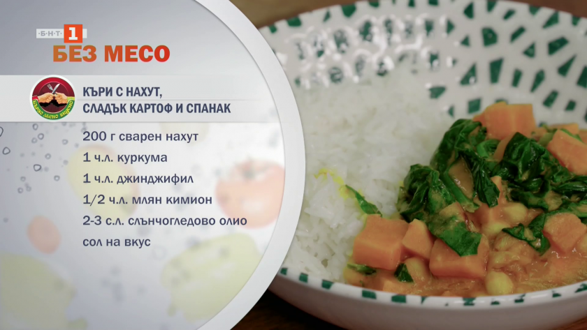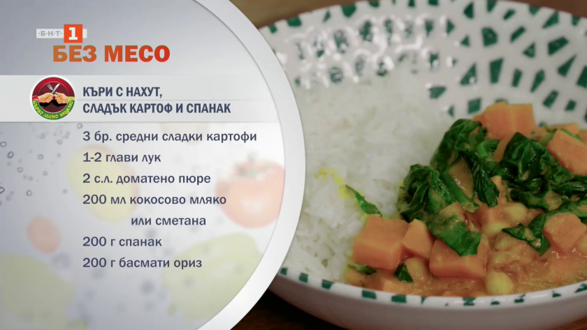 Къри с нахут, сладък картоф и спанак и бишкотена торта с праскови