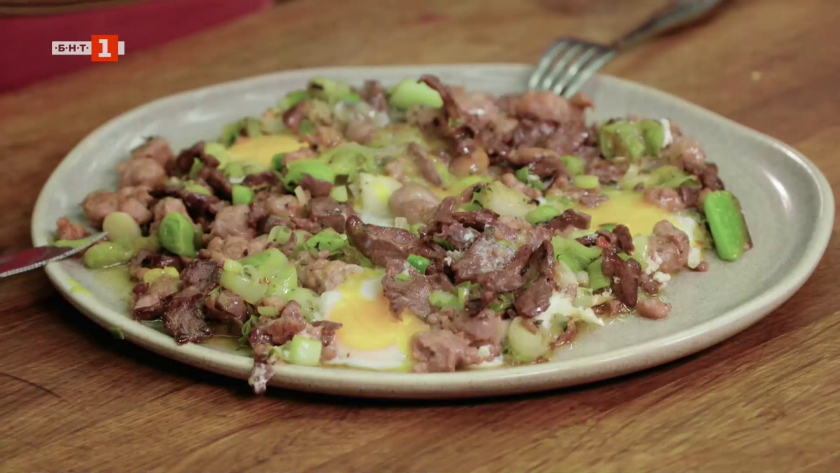 Омлет със зелени домати и сланина и пълнени чушки с булгур и пилешко