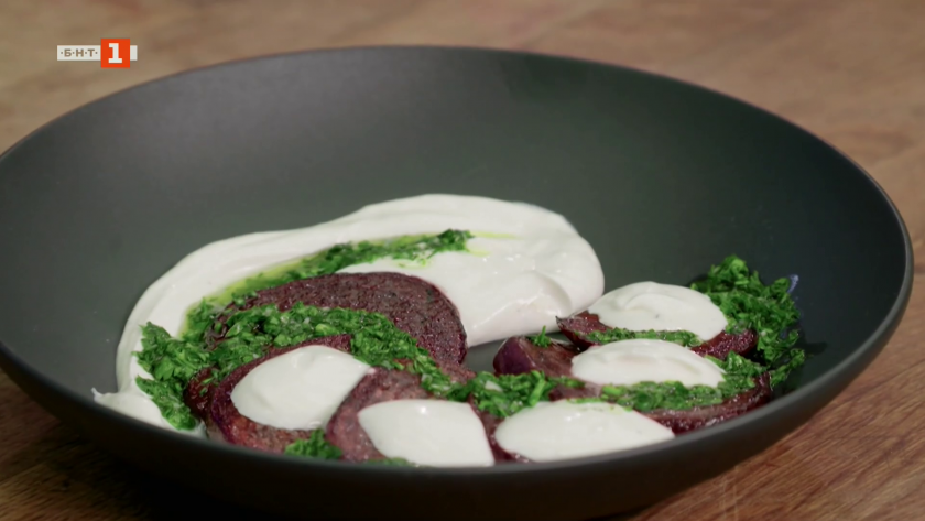 Свинско в сос от червено цвекло и палачинки "Сюзет"