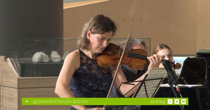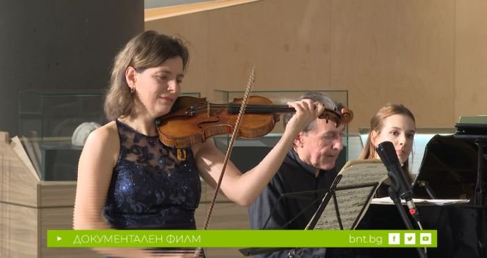 Албена Данаилова (цигулка) и Людмил Ангелов (пиано) свирят дует в концерт от Епископската базилика в Пловдив през 2025.