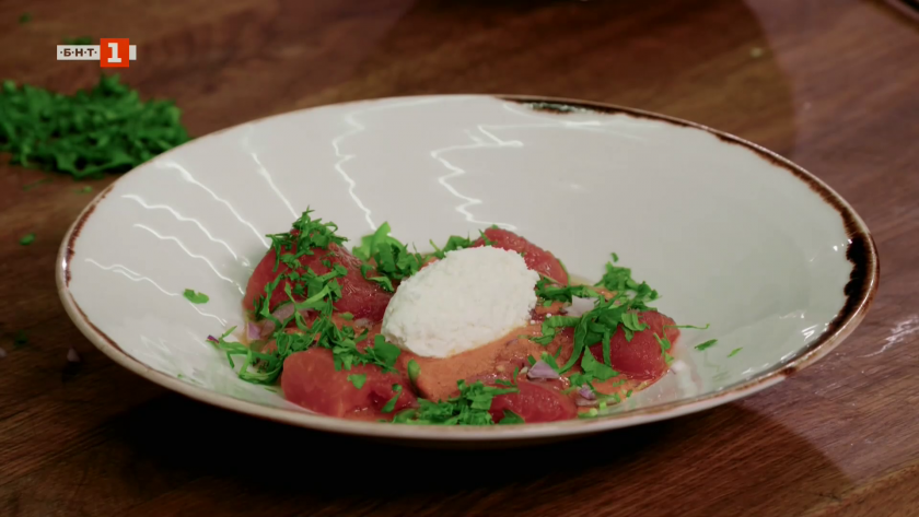 Доматено гаспачо с пъстърва и пълнени чушки с ориз и бекон