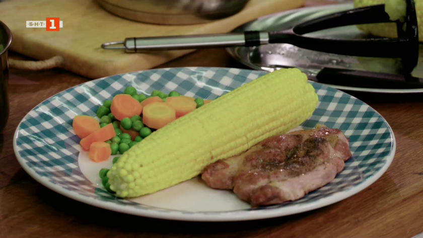 Пържоли с ябълково пюре и зеленчуци и салата Байрак