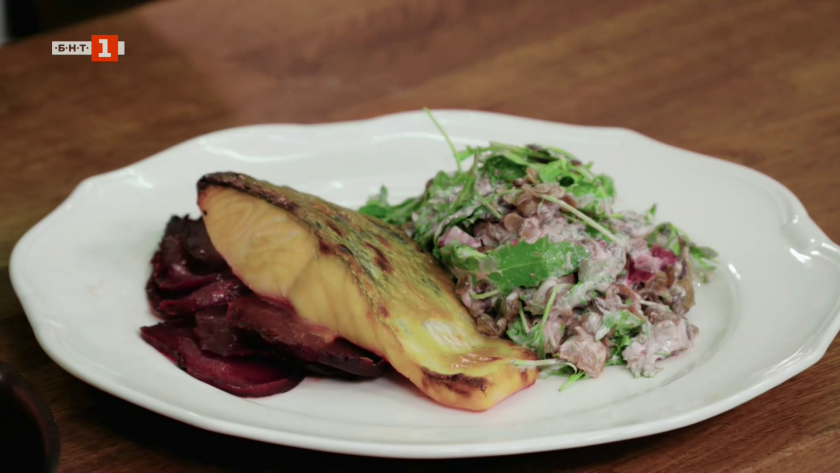 Печена сьомга с леща и цвекло и банички с овче сирене и спанак