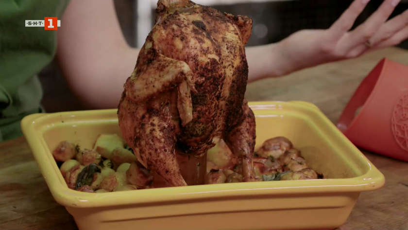 Печено пиле на бутилка с картофи