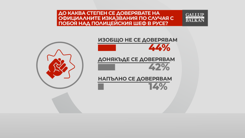 В проучването се задава и въпросът "До каква степен се доверявате на официалните изказвания по случая с побоя над полицейския шеф в Русе". Близо половината от анкетираните - 44% отговарят, че изобщо не се доверяват на такива изказвания. Почти идентичен е процентът на отговорилите, че се доверяват - 42 на сто. Пълно доверие на институциите по въпроса имат едва 14 на сто.