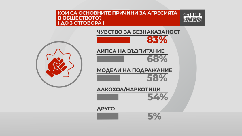 Социолозите от "Галъп Интернешънъл Болкан" проучват и мнението на хората за това кои са основните причини за агресията в обществото. Мнозинството - 83% са категорични, че първопричина за агресията е чувството за безнаказаност. 68 на сто отбелязват липсата на възпитание като ключов проблем. За 58% он анкетираните са изключително важни моделите на подражание. Всеки втори анкетиран смята, че алкохолът и наркотиците са двигател на агресията в обществото.