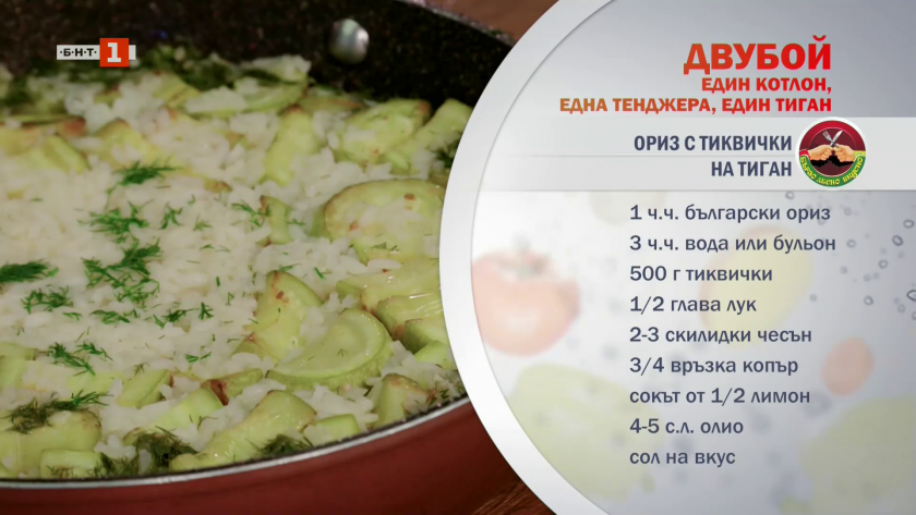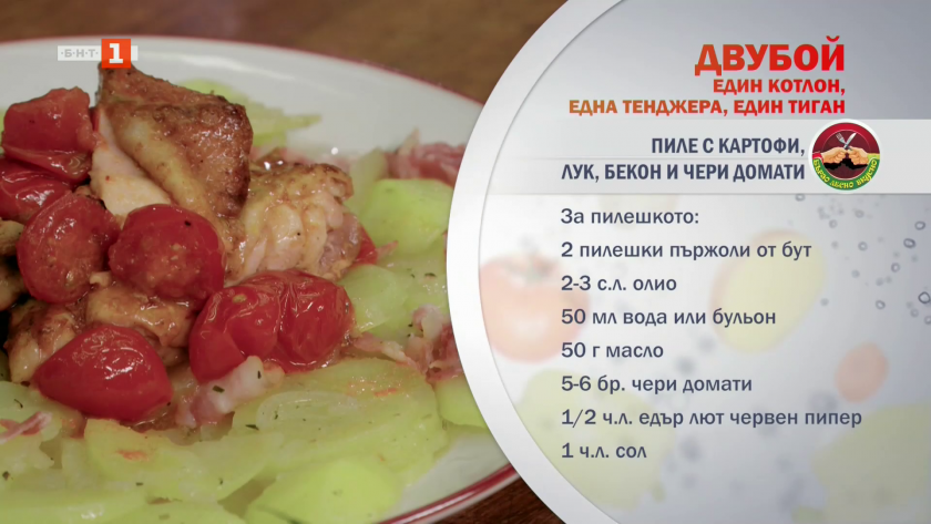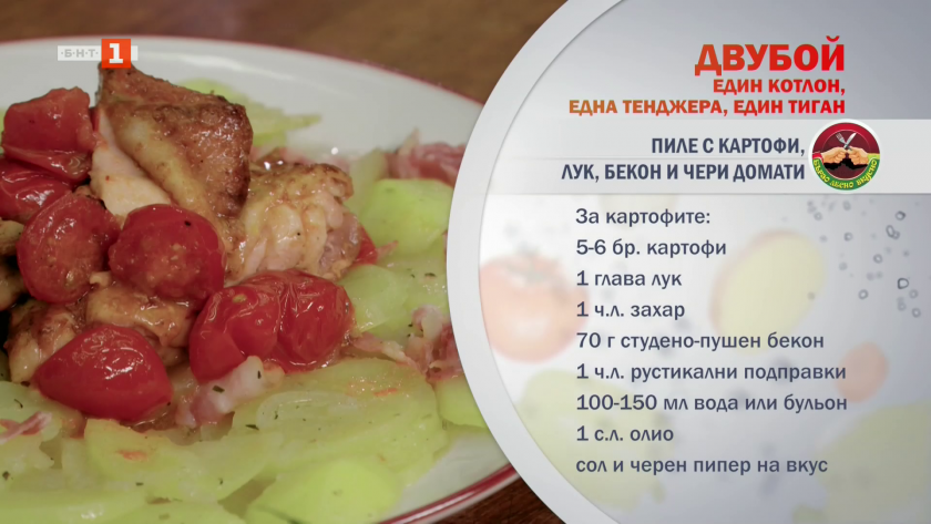 Пиле с картофи, лук, бекон и чери домати и ориз с тиквички на тиган