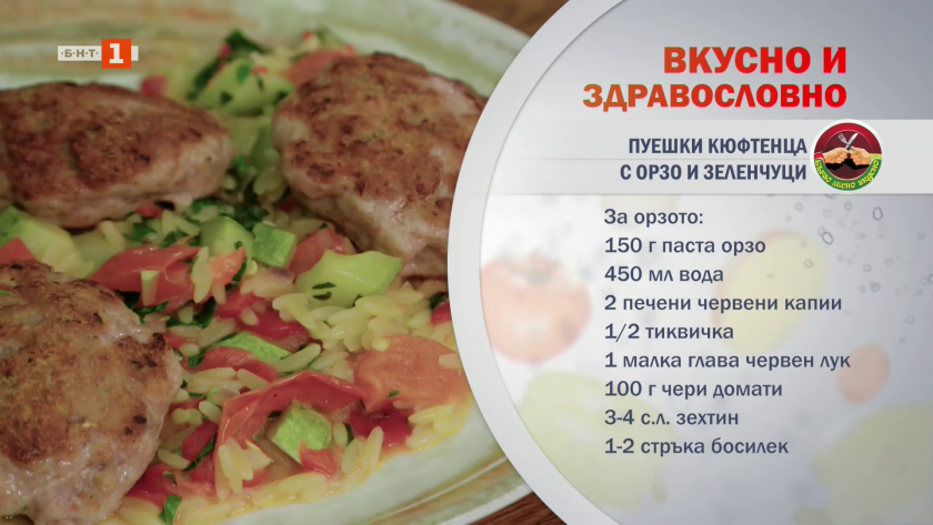 Пуешки кюфтенца с орзо и зеленчуци и печени круши със синьо сирене