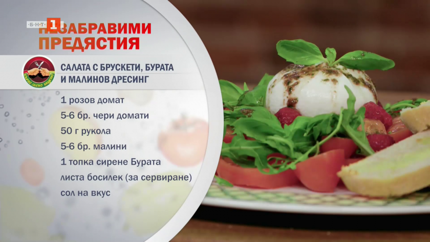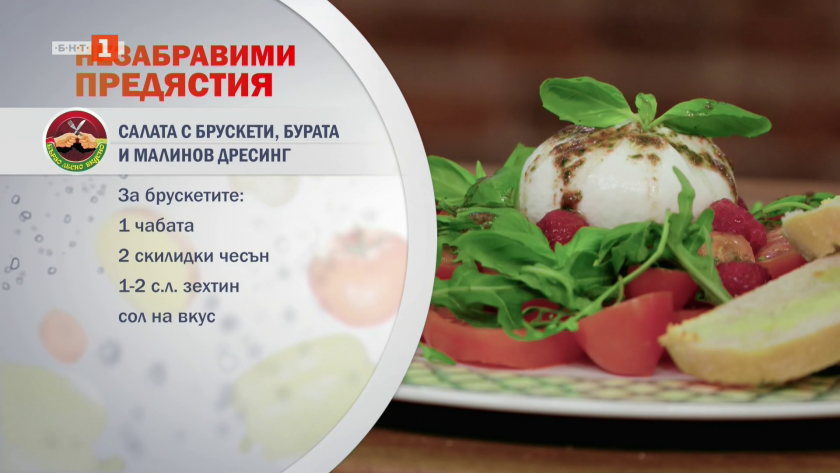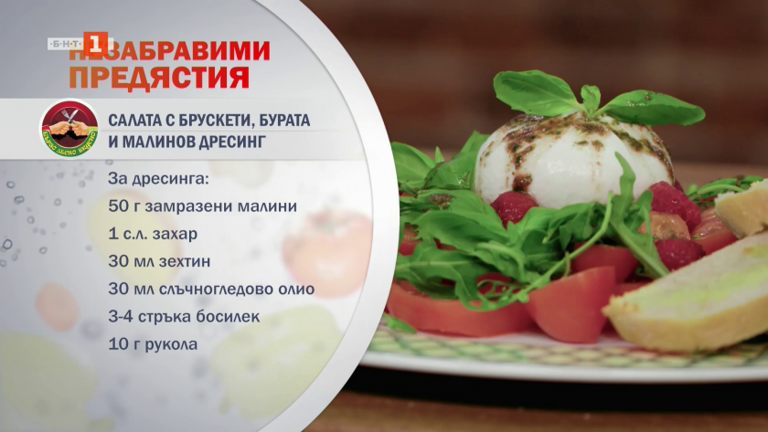 Салата с брускети, бурата и малинов дресинг и свинско с прясно зеле и пащърнак