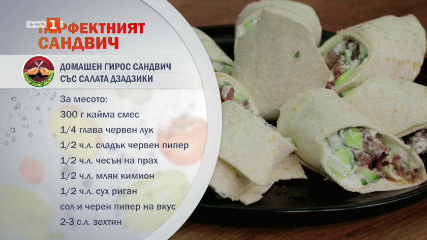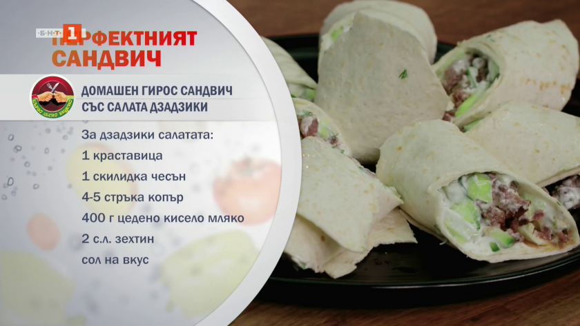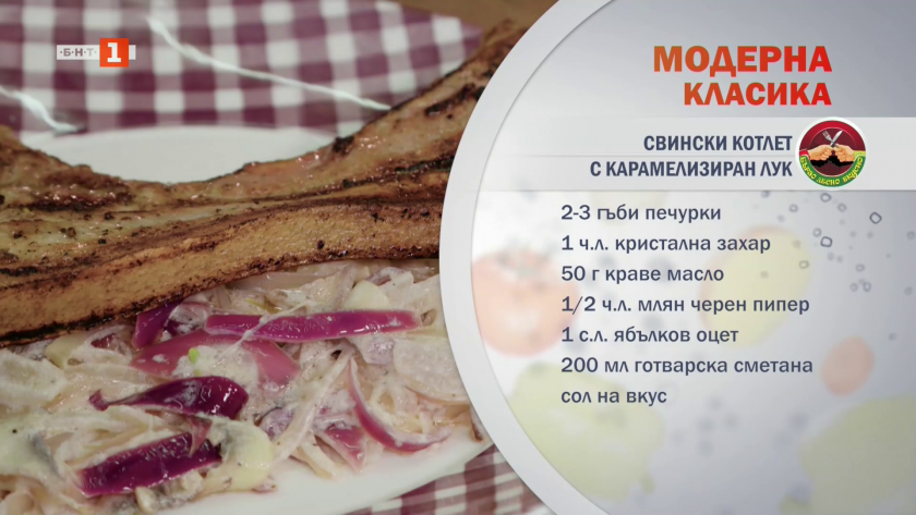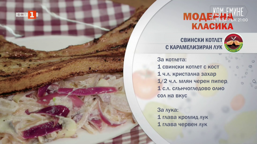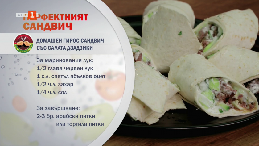 Свински котлет с карамелизиран лук и домашен гирос сандвич със салата дзадзики