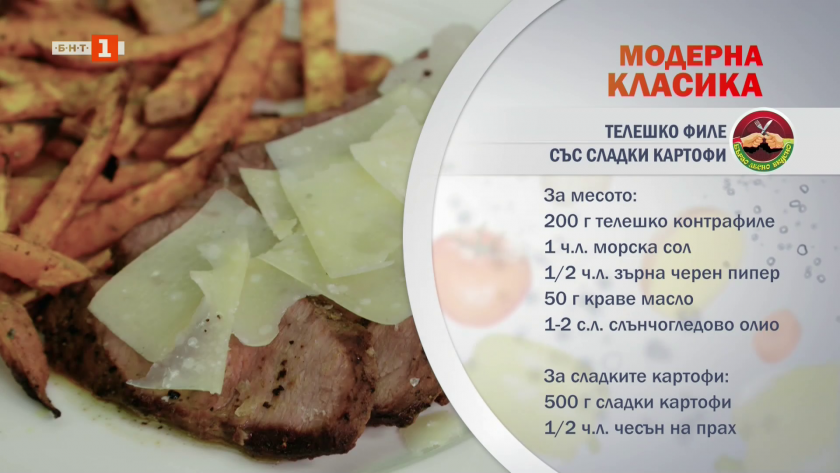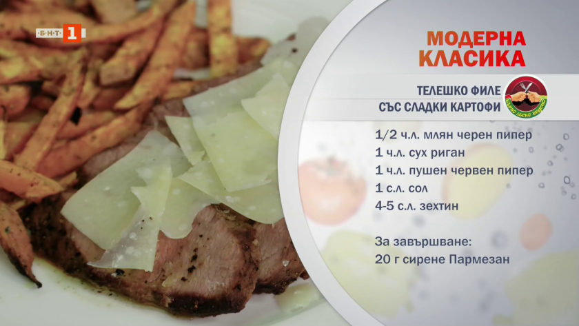 Телешко филе със сладки картофи и ябълков щрудел в бутер тесто